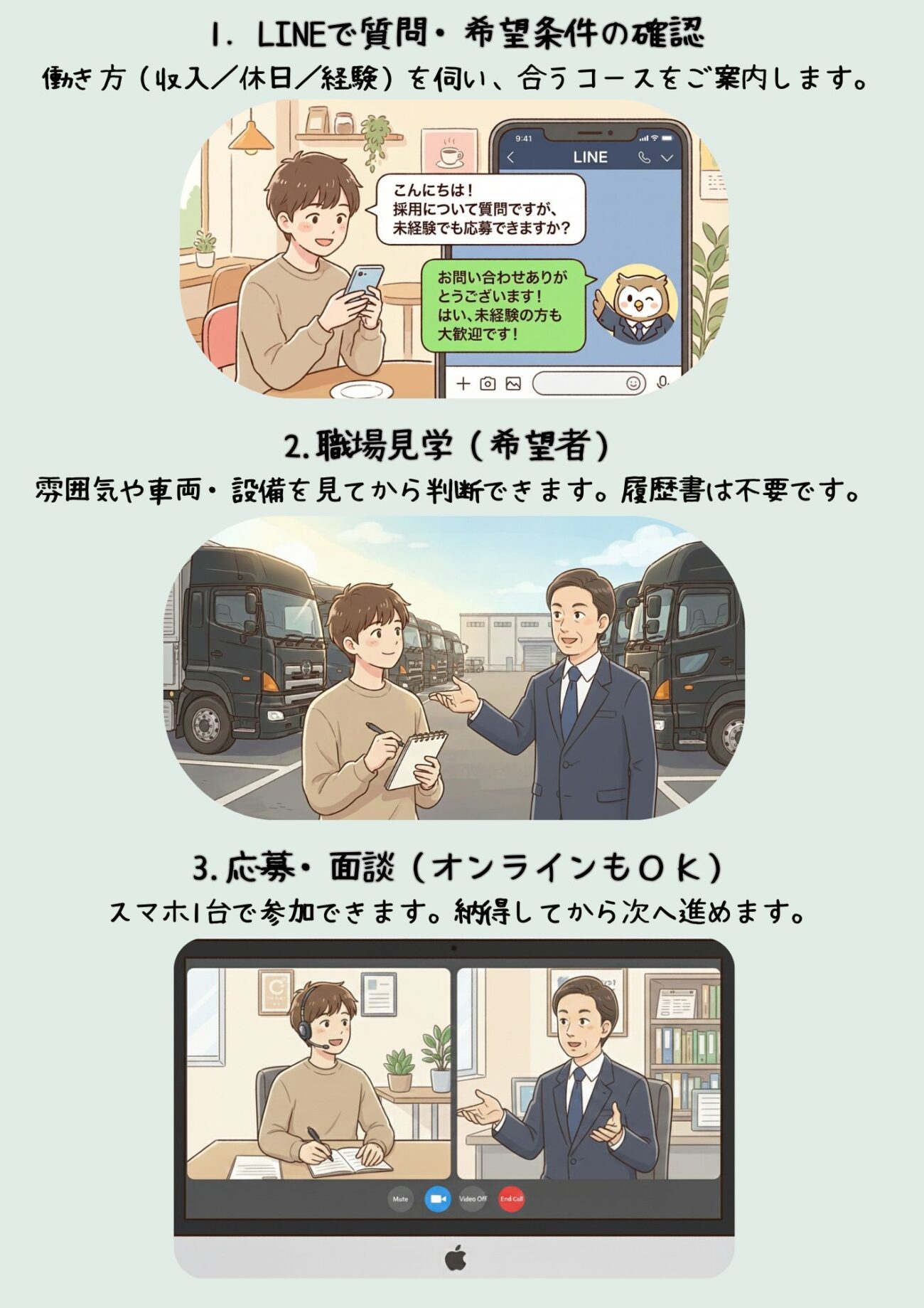 当社では「いきなり面接」は行いません。まずはLINEで質問・見学からご案内しています。